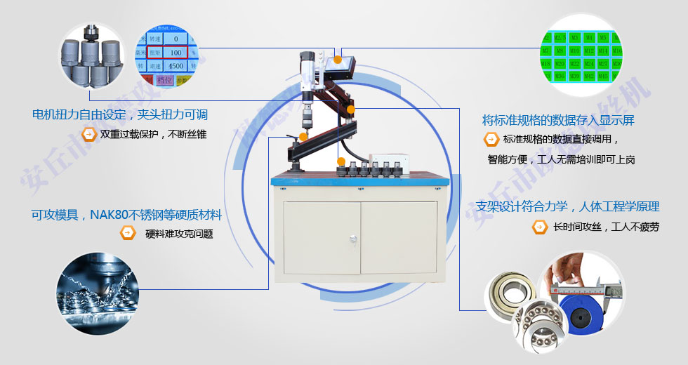 1微電腦控制,扭矩大小可調,盲孔不斷絲錐可根據攻絲的大小自行調節扭矩,加上扭力夾頭過載保護,雙重保護,不斷絲錐;主軸在半徑1200/2000MM內任意移動。